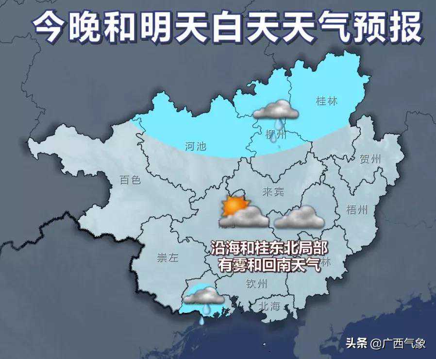 今天晚上和明天白天,桂林、柳州、河池、防城港等市的部分地区有小雨,我区其它地区多云到阴天。沿海和桂东北局部有雾和回南天气。