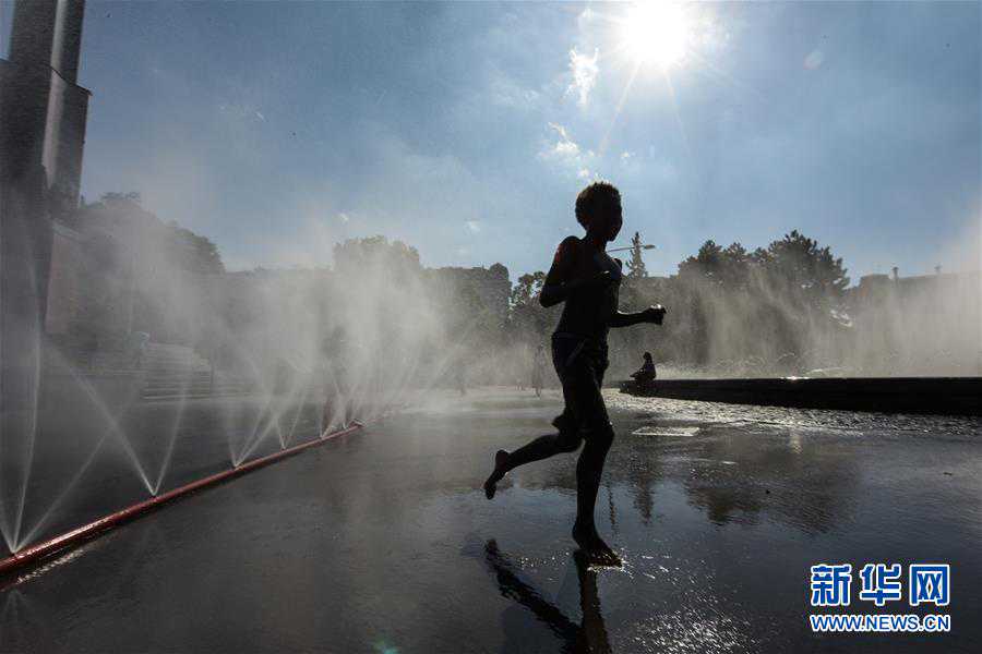 6月26日,一名儿童在奥地利维也纳施瓦岑贝格广场戏水消暑。当日,维也纳最高气温达到36摄氏度,不少居民来到喷泉和水雾喷洒设施旁降温消暑。新华社记者郭晨摄