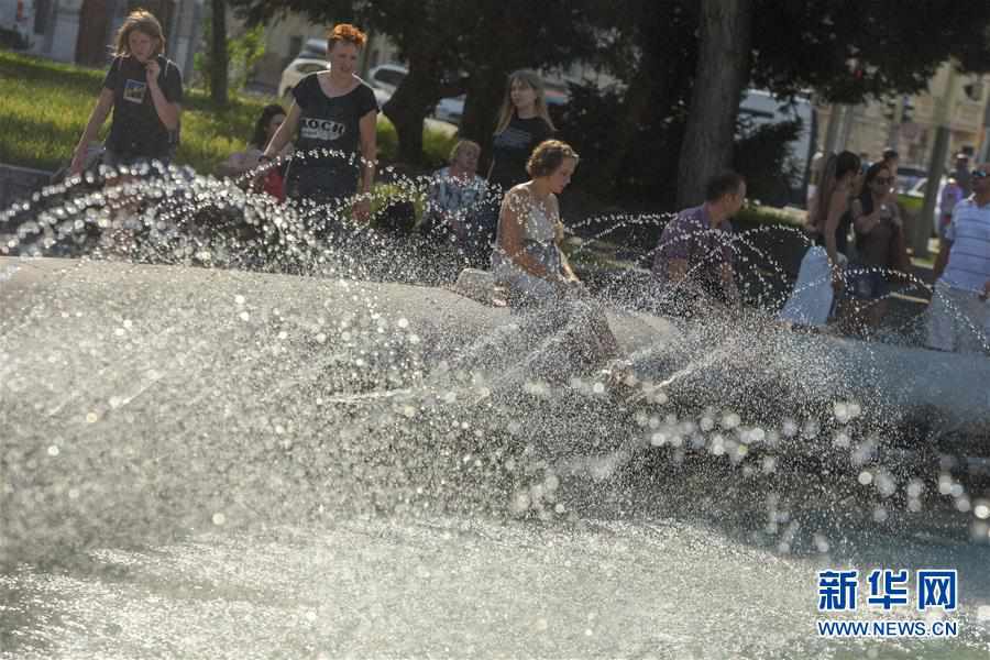 6月26日,人们在奥地利维也纳施瓦岑贝格广场喷泉边消暑。当日,维也纳最高气温达到36摄氏度,不少居民来到喷泉和水雾喷洒设施旁降温消暑。新华社记者郭晨摄