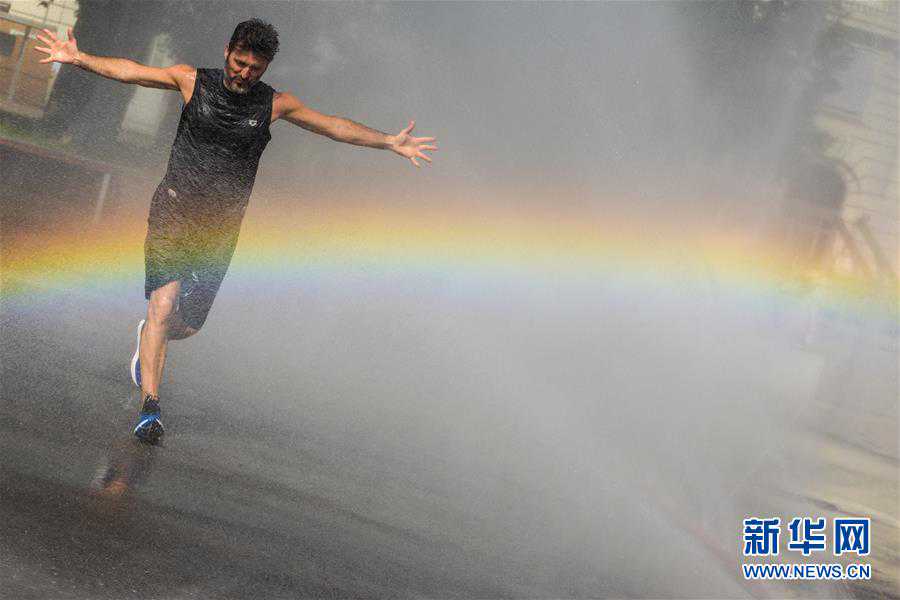 6月26日,一名男子在奥地利维也纳施瓦岑贝格广场戏水消暑。当日,维也纳最高气温达到36摄氏度,不少居民来到喷泉和水雾喷洒设施旁降温消暑。新华社记者郭晨摄
