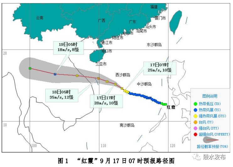 今年第11号台风“红霞”今天(17日)早晨由热带风暴级加强为强热带风暴级,07时其中心位于北纬14.3度,东经113.7度,也就是在海南省三沙市永兴岛南偏东方向约315公里的南海中部海面上,中心附近最大风力有10级(25米/秒),中心最低气压为985百帕,七级风圈半径120~150公里。