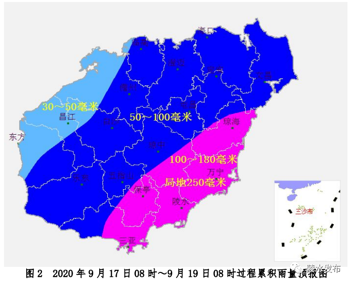预计,9月17日08时~19日08时陵水累计雨量为100~180毫米、局地250毫米。