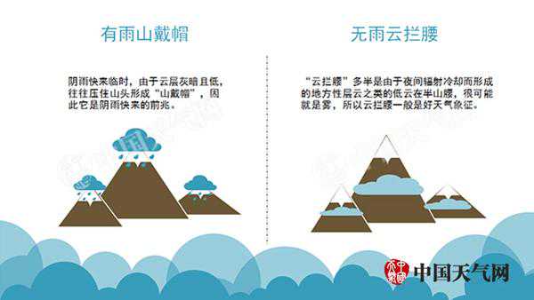 抬头看山,如果云层灰暗且低,那就是“山雨欲来”的前兆。但如果山戴帽后云层不再下降变低,有可能不会下雨。而“云拦腰”的现象,多半是由于夜间辐射冷却而形成的层云,而且很可能只是雾,所以“云拦腰”一般是好天气到来的象征。