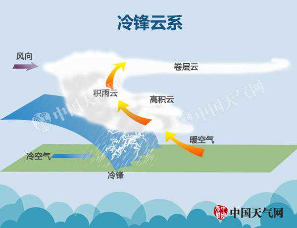 冷锋的话也一样,冷气团推着暖气团走,暖湿气流爬升形成各种云,我们在地面观测的时候,同样是先观测到卷云、卷层云,然后是高积云,云量变多云层变低,意味着积雨云正紧随其后,降水马上就要到来。