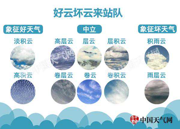 其实,关于云的样子和对应天气,对症下药是关键。“好云”“坏云”其实还真是有区别。数据帝细心地整理了下,不同颜值下的云和好坏天气的关系如下:
