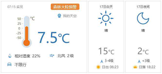 今天白天晴间多云,北风一级转南风三级,阵风五六级,最高气温15℃;夜间晴间多云,南风三级左右转北风一级,最低气温2℃。
