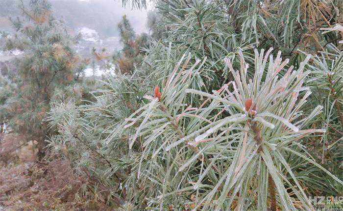 大海乡二道坪村的地里也堆起一层薄雪,松树上挂起了雾凇。(大海乡张娥摄)