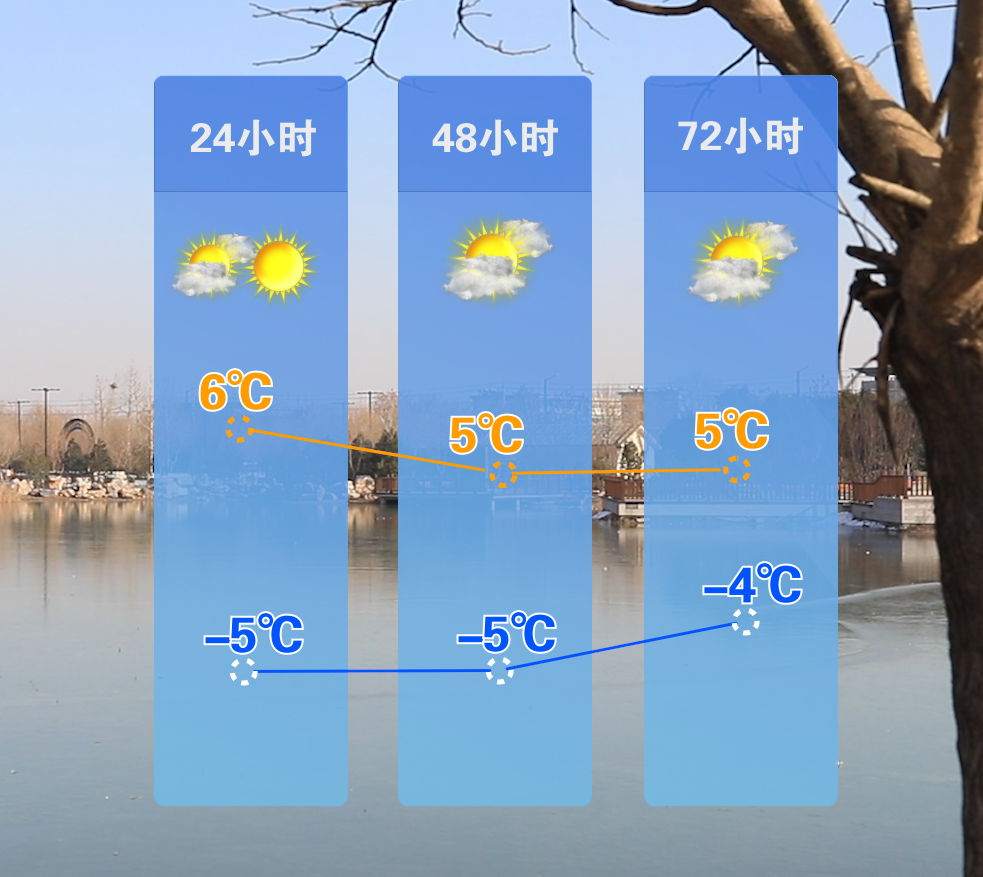 预计未来三天以多云天气为主多云转晴~多云~多云气温依旧回暖模式温度整体波动不大白天最高气温5℃~8℃之间最低气温在-3℃~-7℃之间不过下周新一轮冷空气即将来袭迎来雨雪天气31日夜间到2月1日白天3日白天到4日夜间有小雪或零星小雪受冷空气影响2月1-4日气温下降最高气温持续偏低