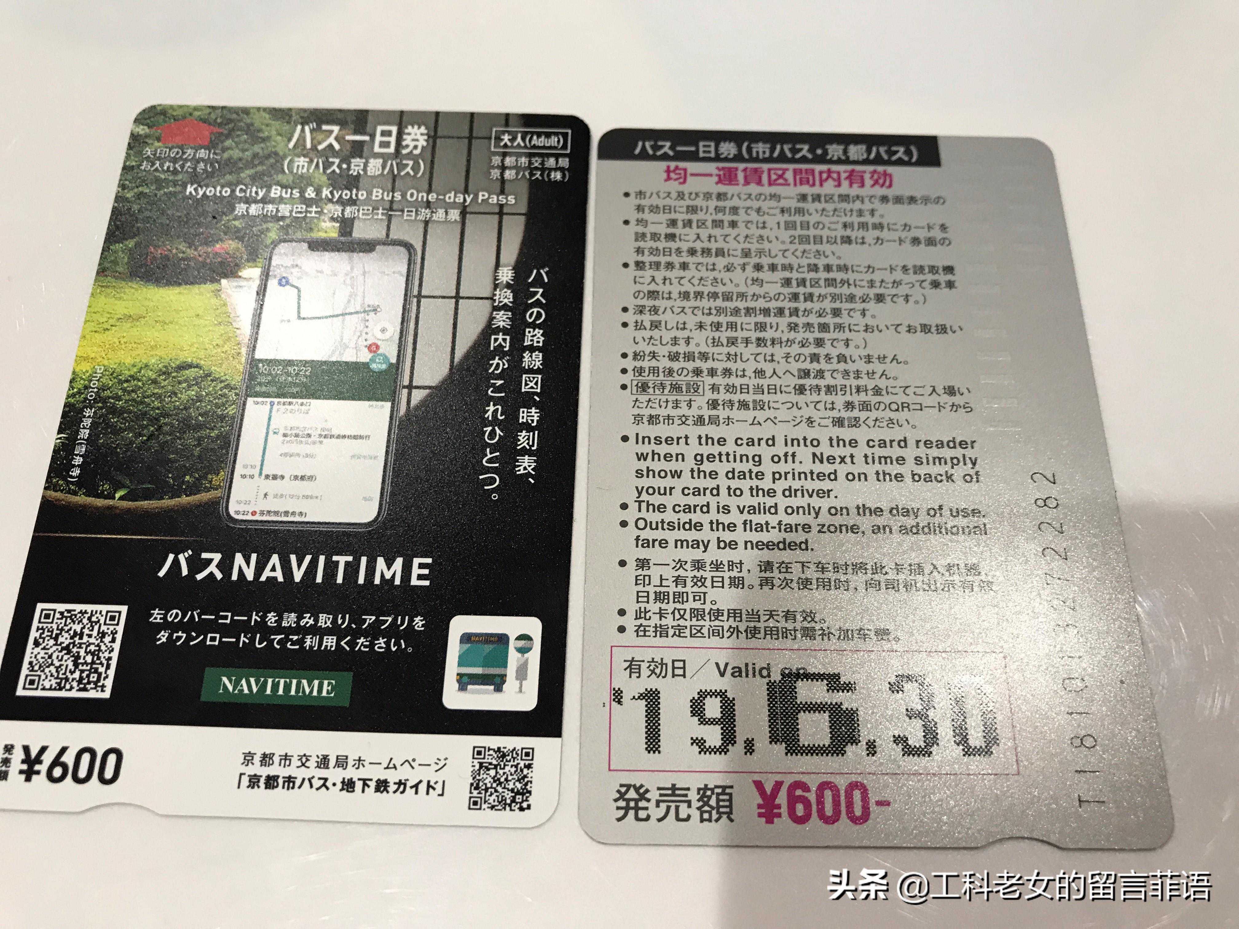 包括地铁的有一日券和两日券,分别为900和1700。我选择的景点不需要坐地铁,所以在京都的几天都是600元的日票。只要是市营的(草绿色的公交车)均可乘坐。