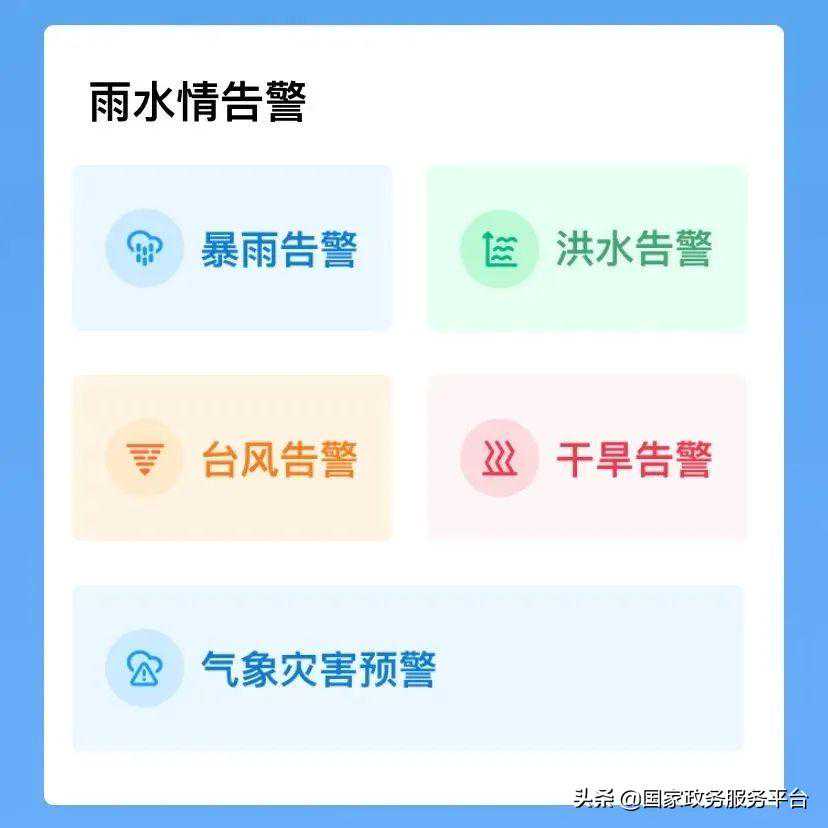预警信息早知道,提前做好防备!“雨水情告警”中的暴雨告警、洪水告警、台风告警、干旱告警、气象灾害预警等服务助您提前知晓灾害天气。