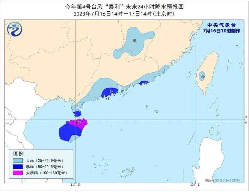 降水方面,7月16日14时至17日14时,广东南部和北部、海南岛、福建东南部、江西中部和南部、台湾岛南部等地的部分地区有中到大雨,其中海南岛、雷州半岛南部、广东南部沿海等地局地有暴雨或大暴雨(100至160毫米)。