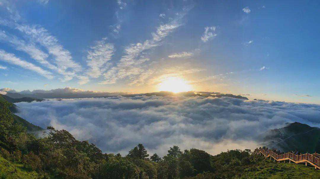 修至山顶的通天栈道,轻松就可登顶。当登上山巅的那一刹那,看见朝阳之下,云海翻涌。