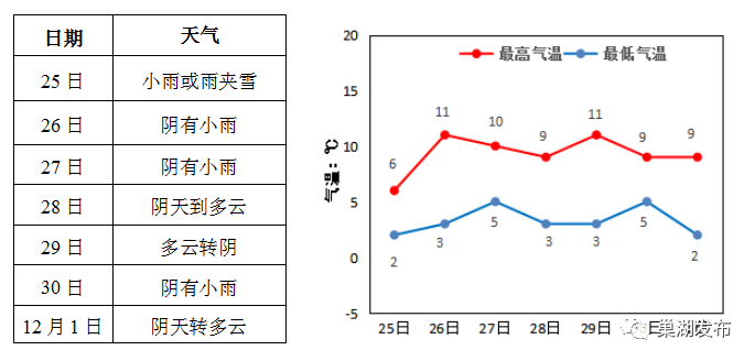 今晨市区出现雨夹雪;本周25-27日和30日前后全市有两次降水过程,最高气温10℃左右,最低气温2-5℃,天气湿冷。具体预报: