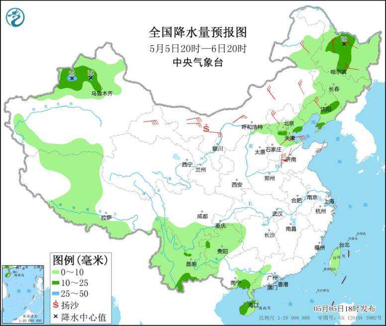 5月5日20时至6日20时,内蒙古东北部、东北地区大部、华北中部、新疆北部、西藏中部和南部、四川南部、云南、贵州大部、广西南部、广东西部、海南岛、台湾岛等地部分地区有小到中雨,其中,新疆伊犁河谷等地局地有大雨(25~35毫米)。内蒙古大部、东北地区大部、华北大部、黄淮北部等地部分地区有4~6级风,局地7级以上大风(见图2)。