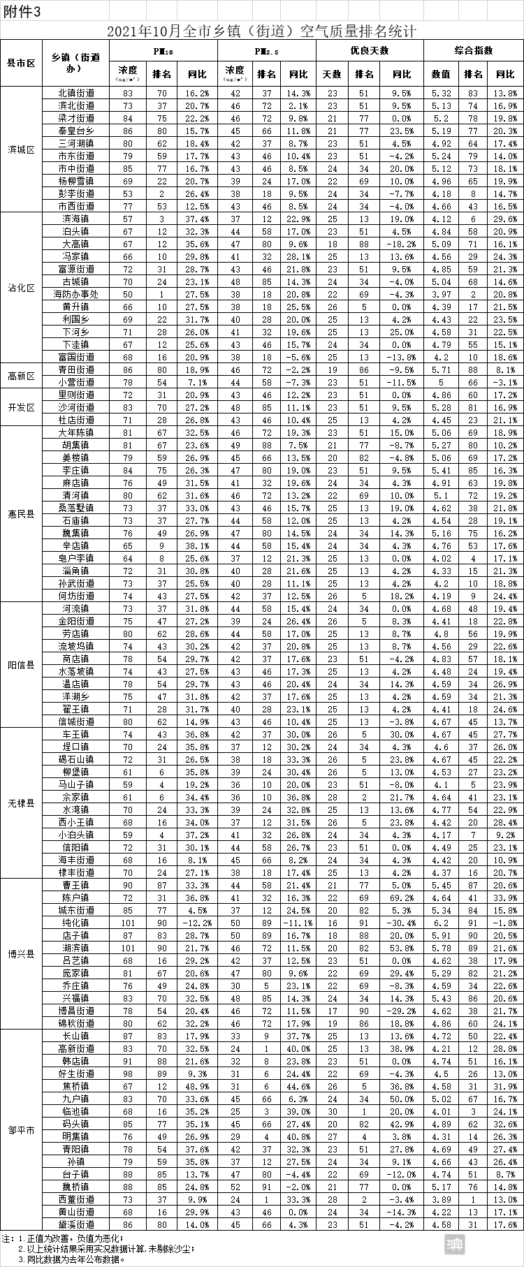 2021年10月空气质量考核排名前五位的分别是:邹平市焦桥镇、邹平市临池镇、沾化区滨海镇、无棣县西小王镇、无棣县佘家镇;空气质量考核排名后五位的分别是:博兴县纯化镇、邹平市魏桥镇、邹平市台子镇、高新区青田街道、惠民县胡集镇。