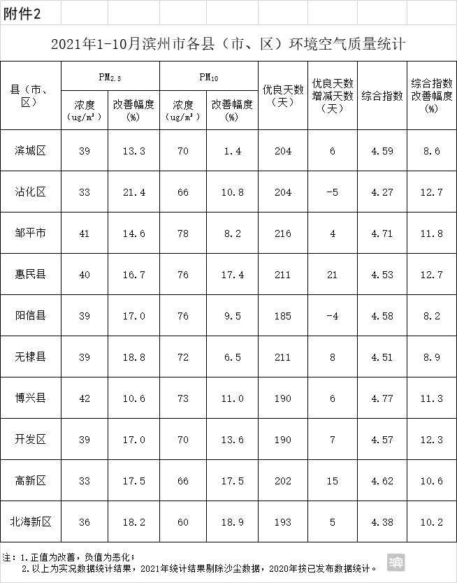 细颗粒物()浓度最低的是高新区和沾化区,为33微克/立方米;浓度最高的是博兴县,为42微克/立方米。各县(市、区)同比均有不同程度的改善,改善幅度最大的是沾化区,为21.4%。