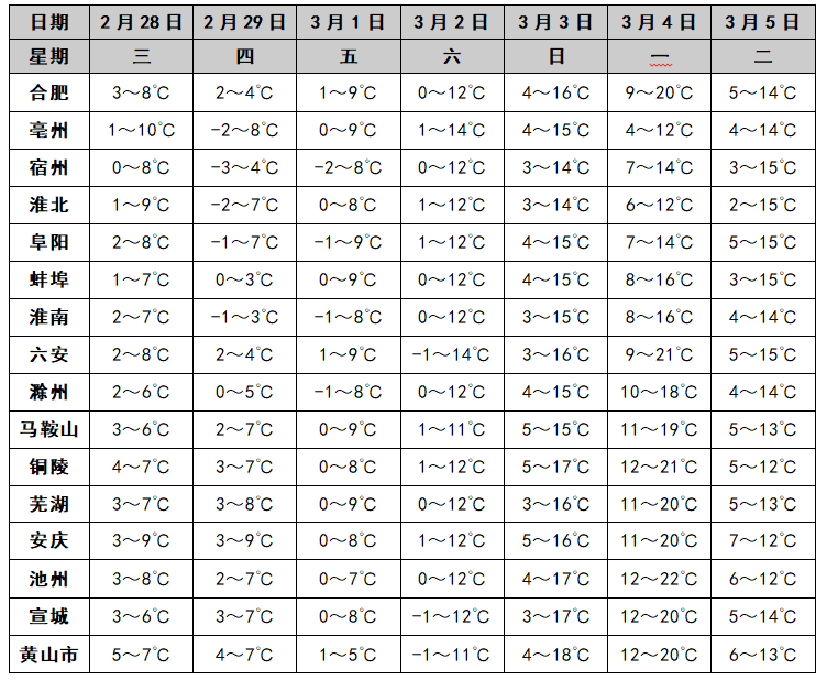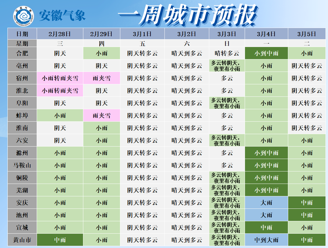 降水:今明两天淮北部分地区和大别山区有雨夹雪或雪,沿江江南有小到中雨,其他地区有小雨。3月3日夜里至5日我省还有一次降水过程,其中4日江淮之间南部和江南部分地区有中到大雨。