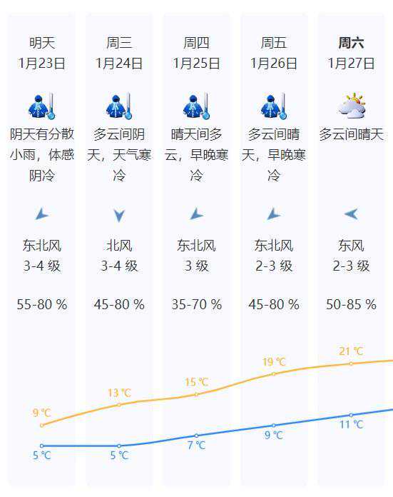 23日小雨伴大风,气温徘徊在5-8℃之间,体感非常阴冷;24日云层变薄,部分可见阳光,天气仍寒冷;25日白天起气温逐日回升。