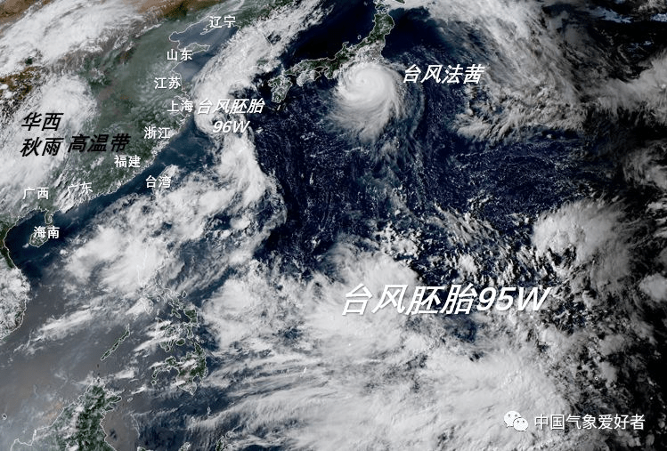 目前,随着台风玲玲变性远去和剑鱼残余低压的消散,目前西北太平洋上共有三个台风或台风胚胎活动,它们分别是日本东京附近的强台风法茜、我国上海附近的台风胚胎96W、以及菲律宾以东庞大的台风胚胎95W。