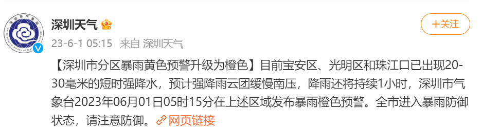 06时40分深圳解除分区雷雨大风黄色预警和所有暴雨预警高温橙色预警降级为黄色
