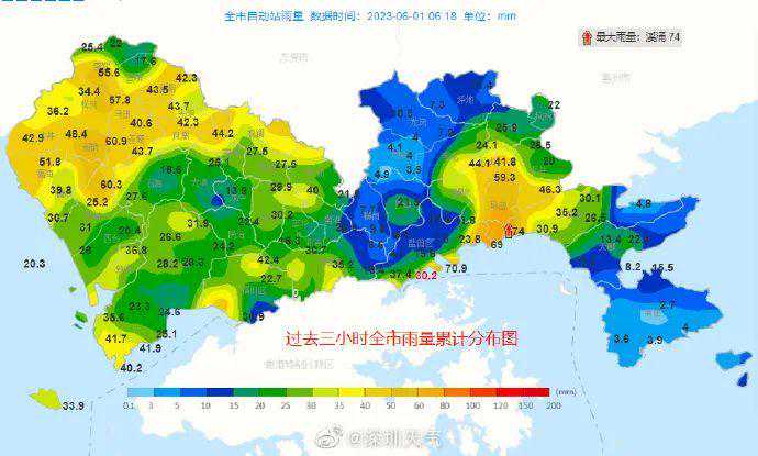 今早03-06时深圳平均雨量24.2毫米全市最大雨量73.2毫米最大1小时雨量64.6毫米