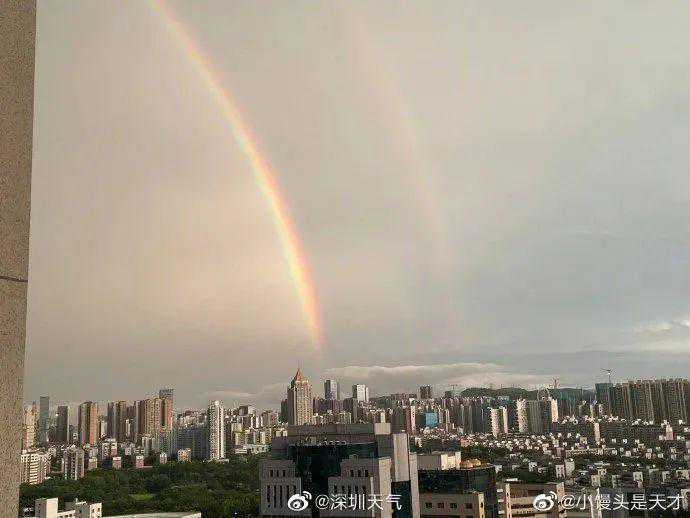 目前强降雨云系已南移深圳各区雨势减弱趋停雨过天晴,彩虹再现