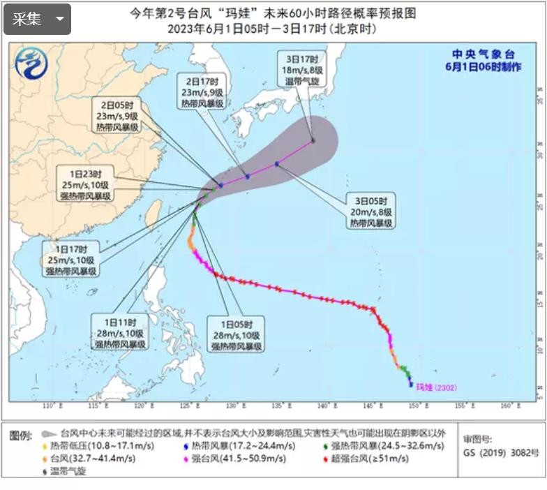 今年第2号台风“玛娃”(Mawar)已于昨天夜间由台风级减弱为强热带风暴级,今天(6月1日)早晨5点钟其中心位于日本冲绳县那霸市西南方向大约340公里的西北太平洋洋面上,就是北纬23.9度、东经125.5度,中心附近最大风力有10级(28米/秒),中心最低气压为980百帕,七级风圈半径200-400公里,十级风圈半径100-200公里。预计,“玛娃”将以每小时15-20公里的速度向北偏东转东北方向移动,强度逐渐减弱,3日在日本南部洋面变性为温带气旋。