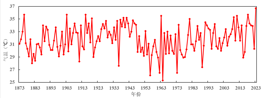 1873-2023年5月上海市区(徐家汇站)极端最高气温