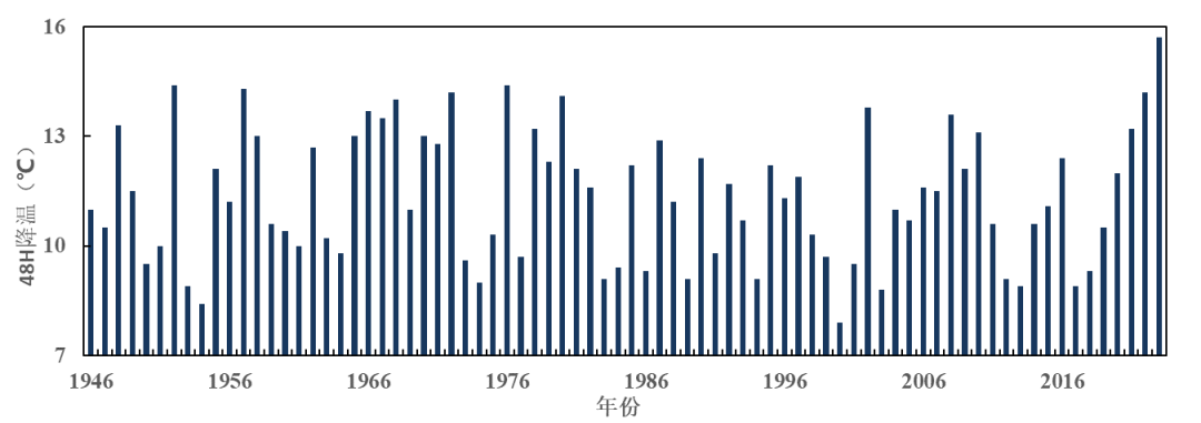 1946-2023年上海市区(徐家汇站)日最低气温48小时最大降幅