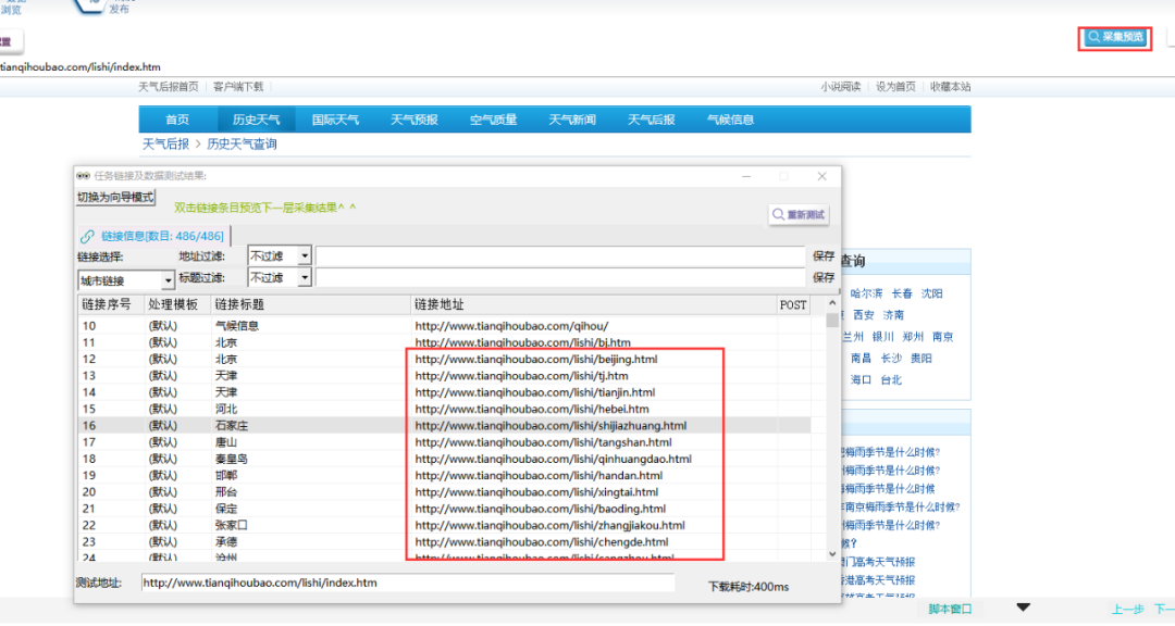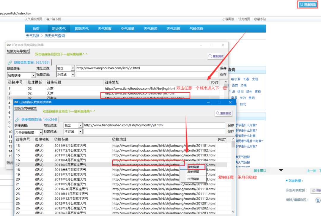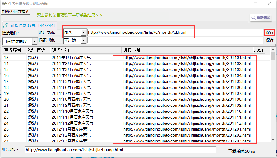 ③使用链接过滤的方法来获取列表链接,先采集预览,打开列表链接预览结果,找到月份链接并观察规律,发现其中都包括:“”