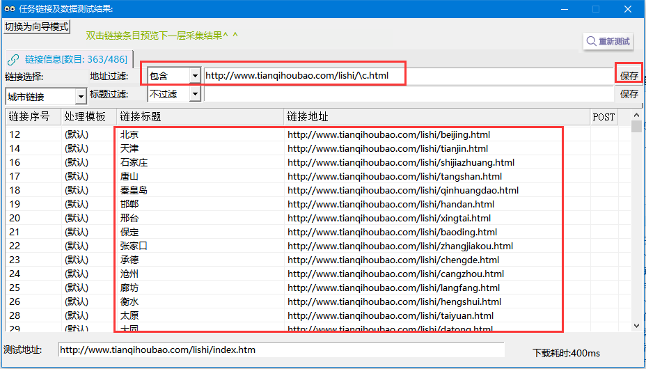 ②设置地址过滤,过滤包含“\”的链接,\c表示一串英文字母,这样就把城市链接过滤出来了。