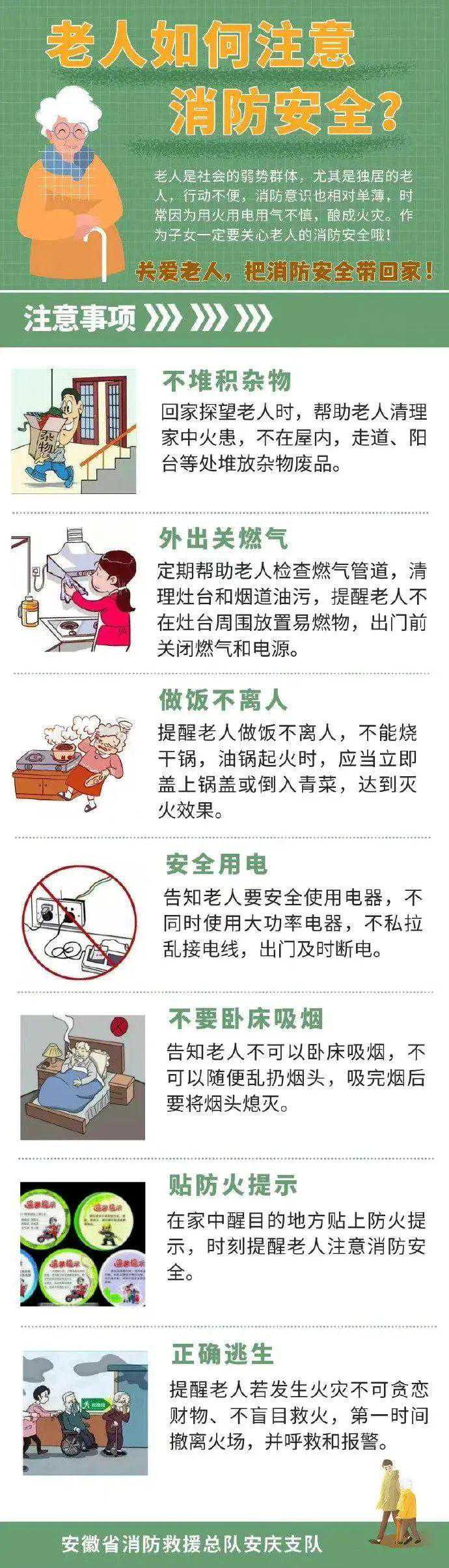 老人是社会的弱势群体,特别是独居的空巢老人,他们消防安全意识相对淡薄,行动也不方便,一旦发生火灾,很容易造成严重后果。作为子女日常生活中应该怎么做,才能帮助老人提高消防安全意识呢?下面这份《老人消防安全常识》请带回家,让家中的老人知道!