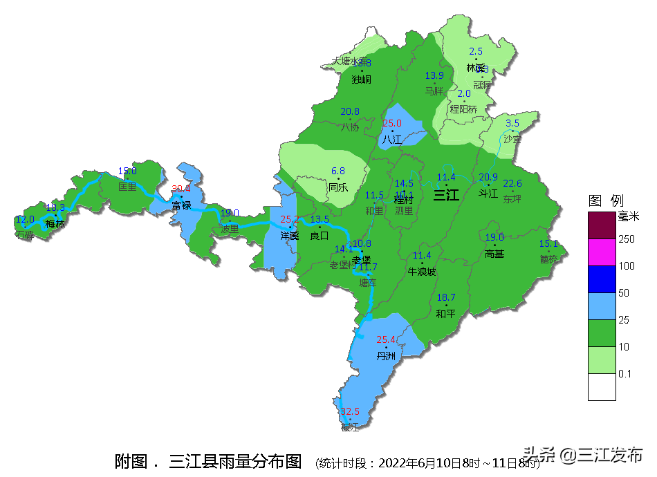 2022年6月10日8时—11日8时,受低涡切变影响,我县出现了中雨到大雨。根据自动气象站资料统计,5个站出现了大雨,最大雨量32.5毫米(丹洲板江村),最大1小时雨量18.9毫米(丹洲板江村,10日23时)。