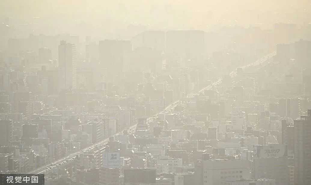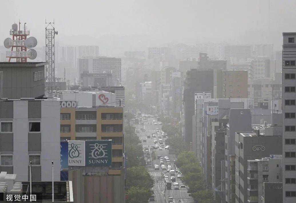当地时间2023年4月12日,日本福冈市,天空朦胧一片,被沙尘笼罩。