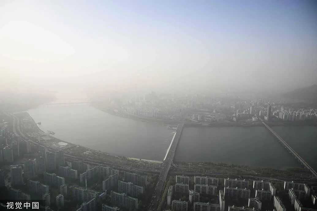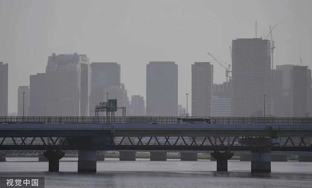 当地时间2023年4月12日,韩国首尔,汉江两岸的建筑物被沙尘笼罩。