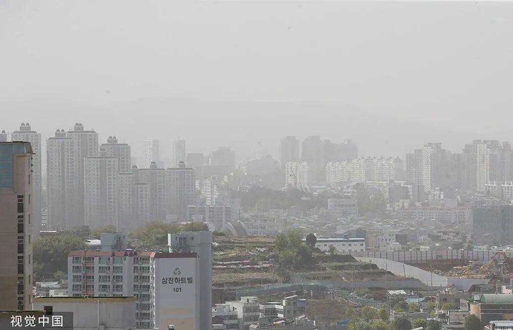 当地时间2023年4月12日下午,韩国光州,随着浓重的沙尘袭击全国,市中心呈现一片灰蒙蒙的景象。