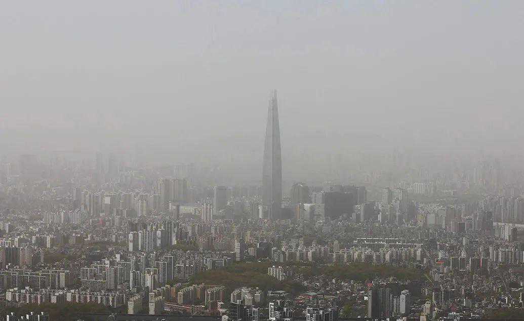 当地时间2023年4月12日,韩国首尔,建筑物被沙尘笼罩。
