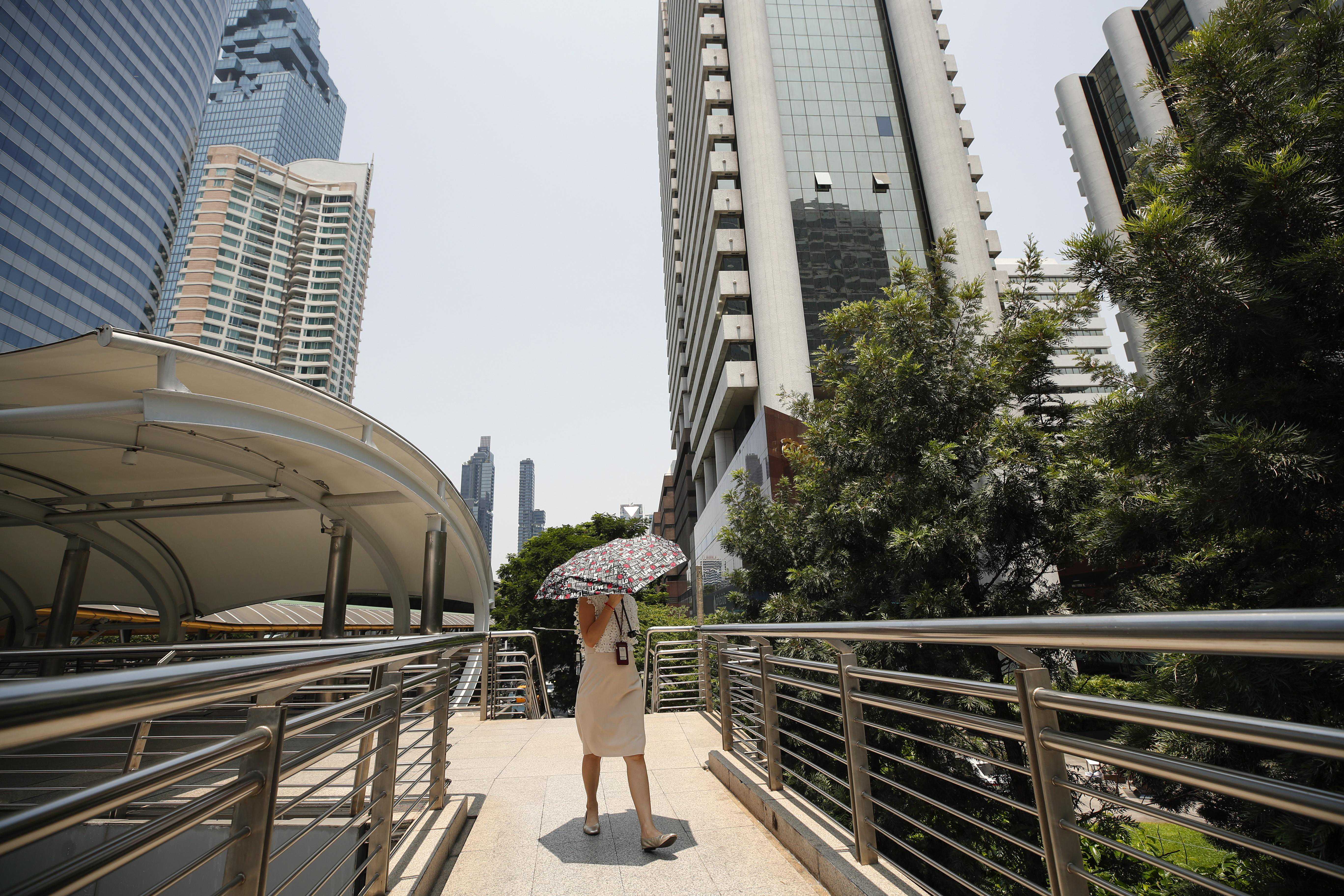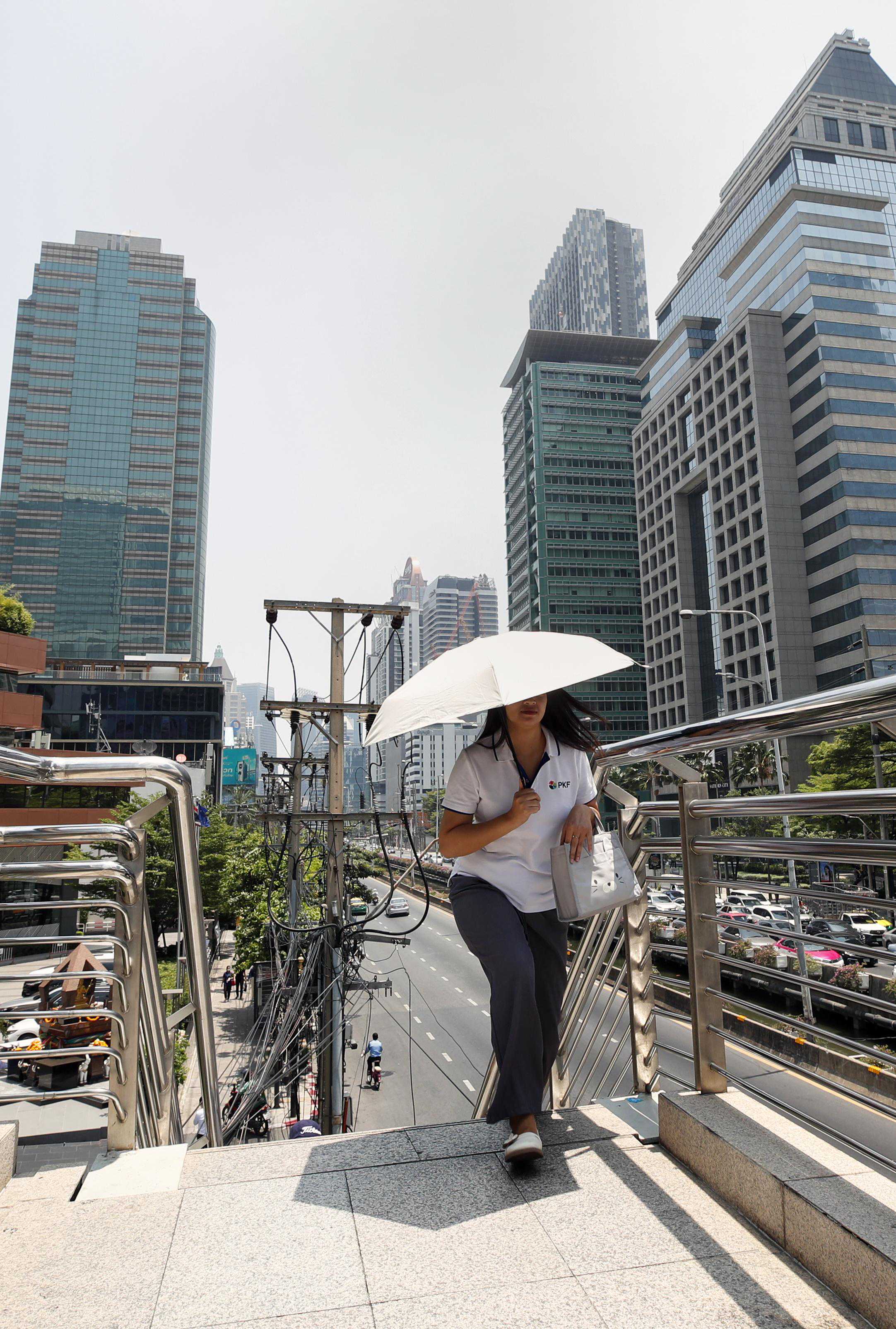 4月2日,在泰国首都曼谷,一名女子打伞遮阳。新华社/欧新