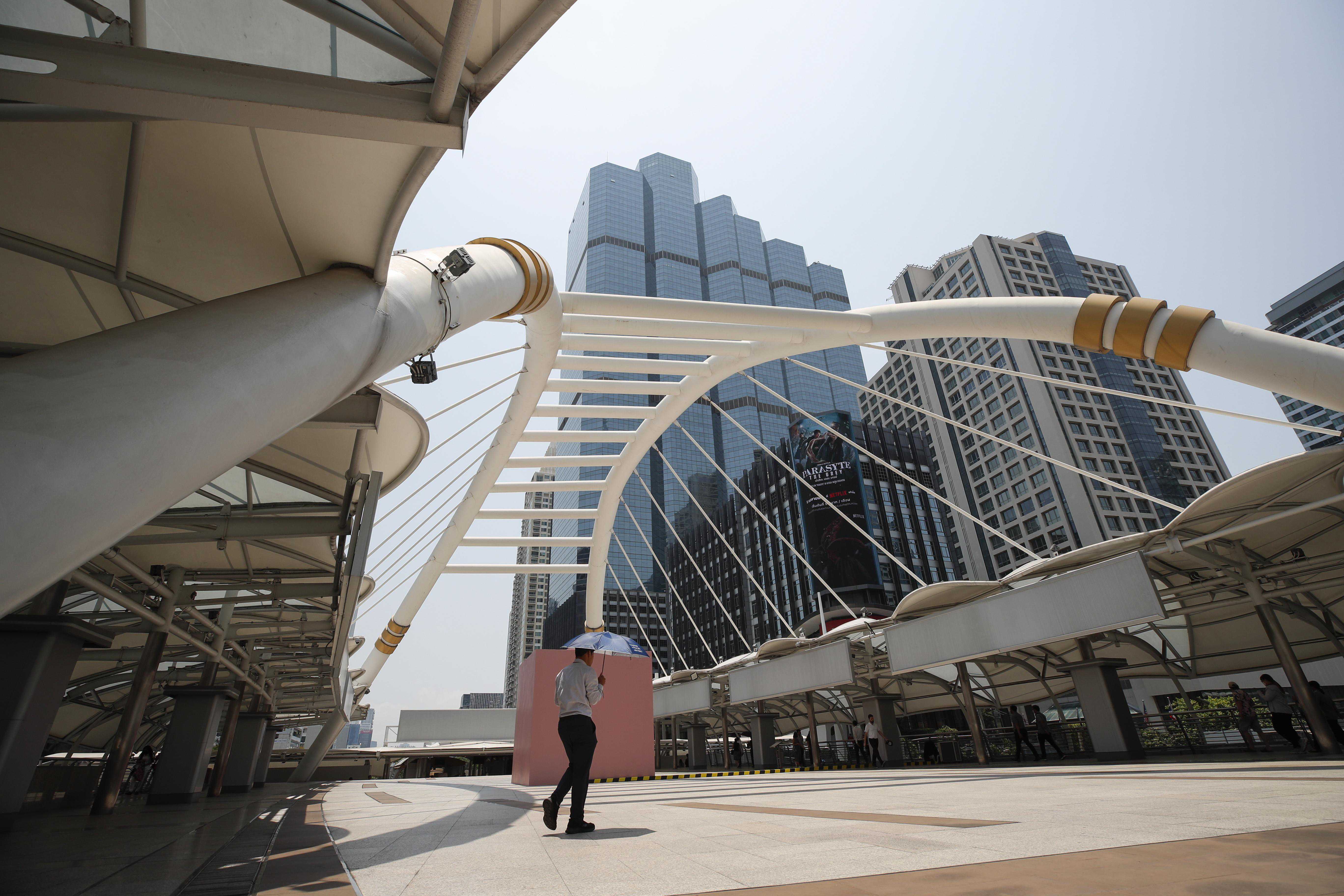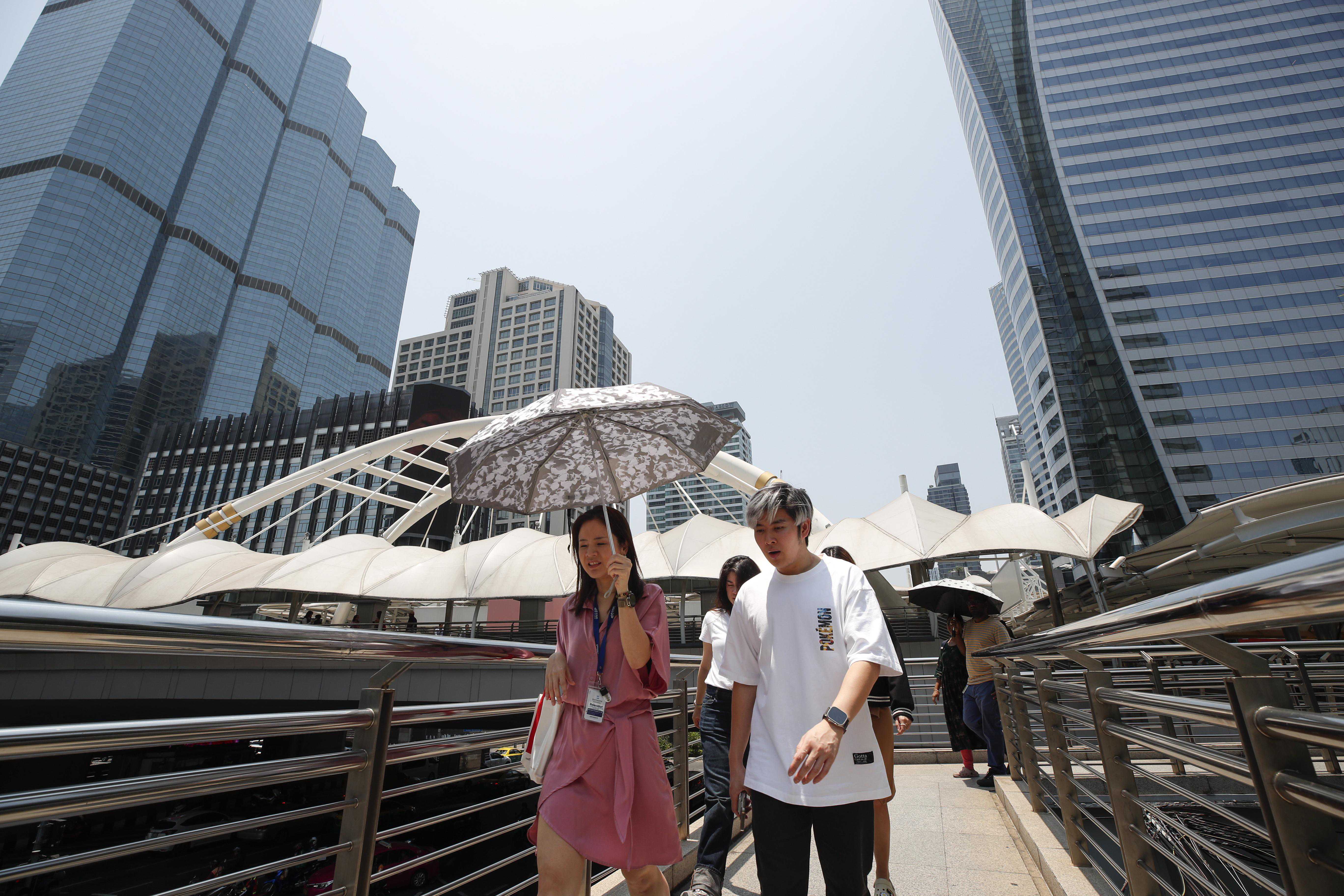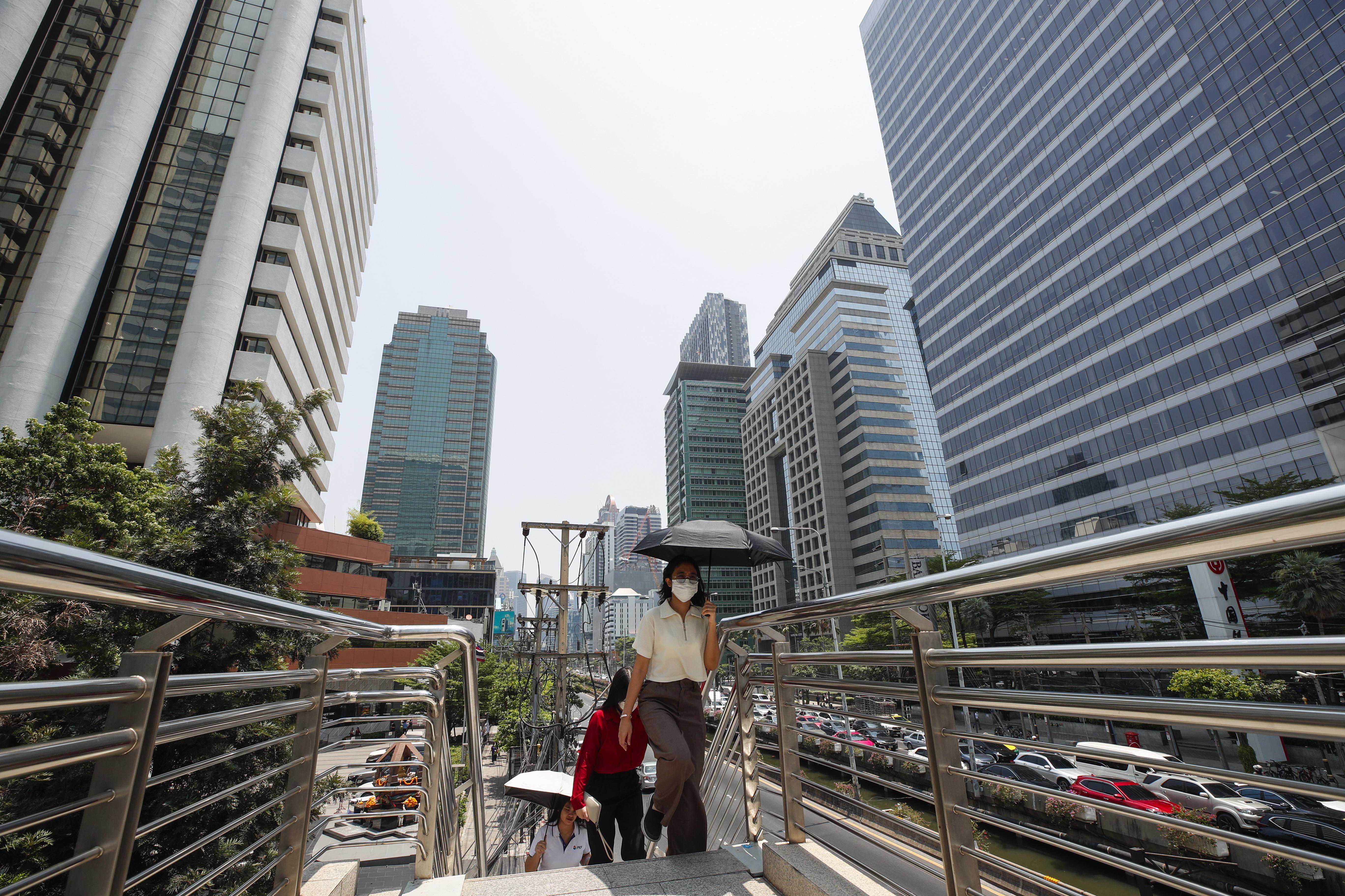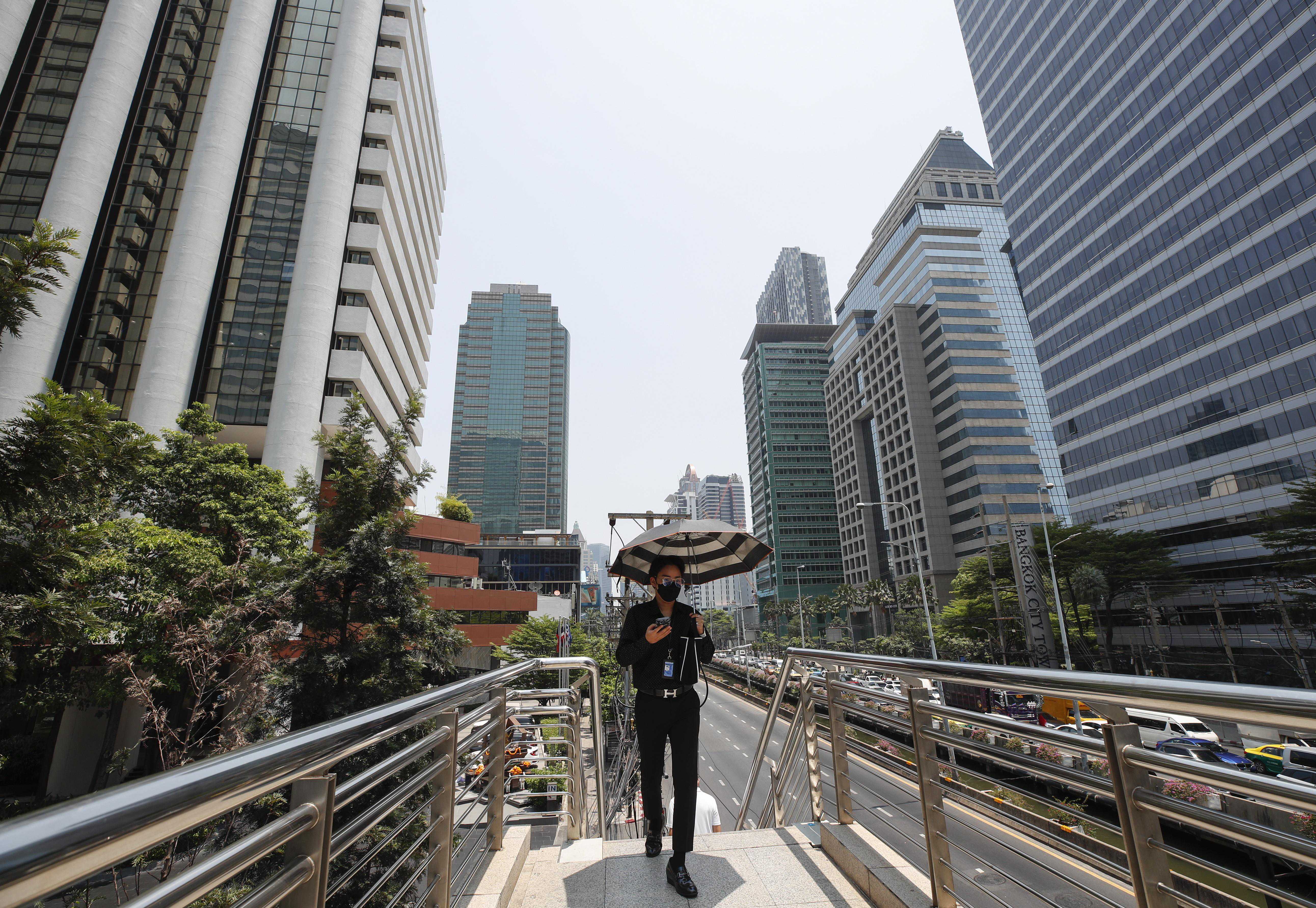 4月2日,在泰国首都曼谷,行人打伞遮阳。新华社/欧新