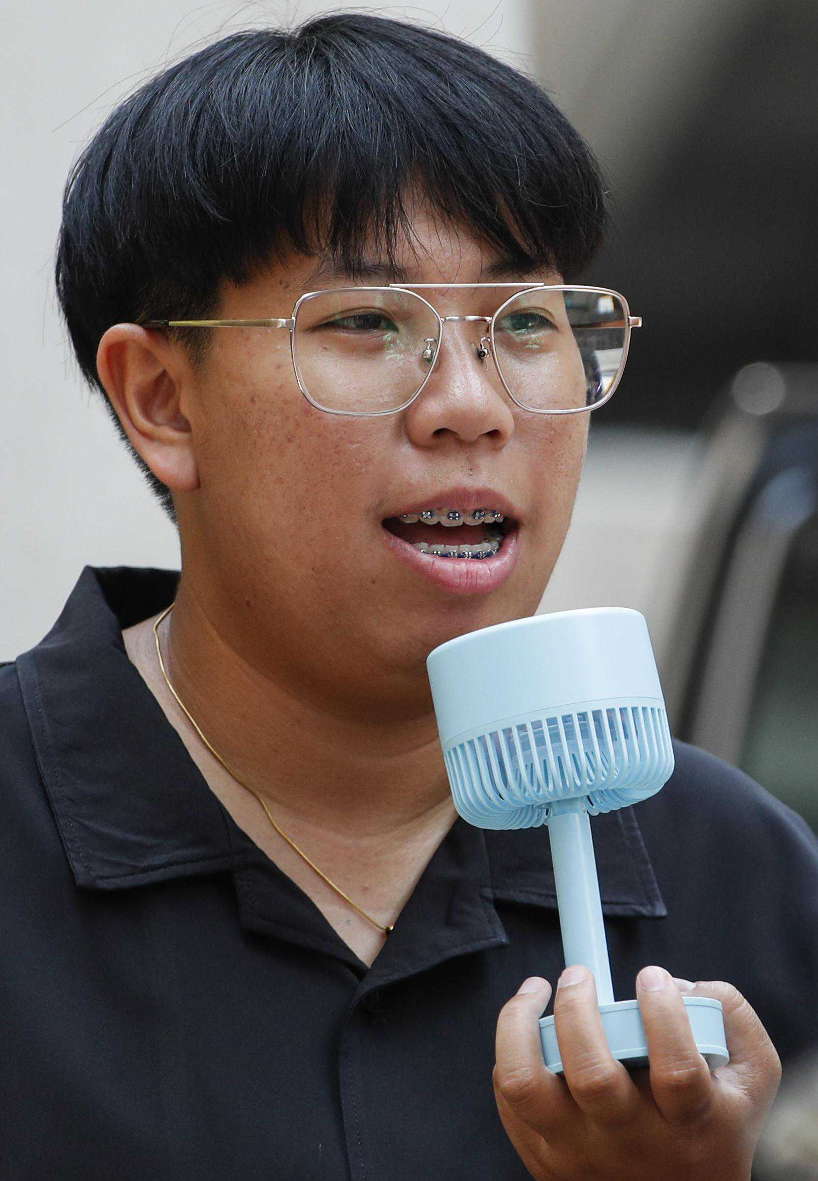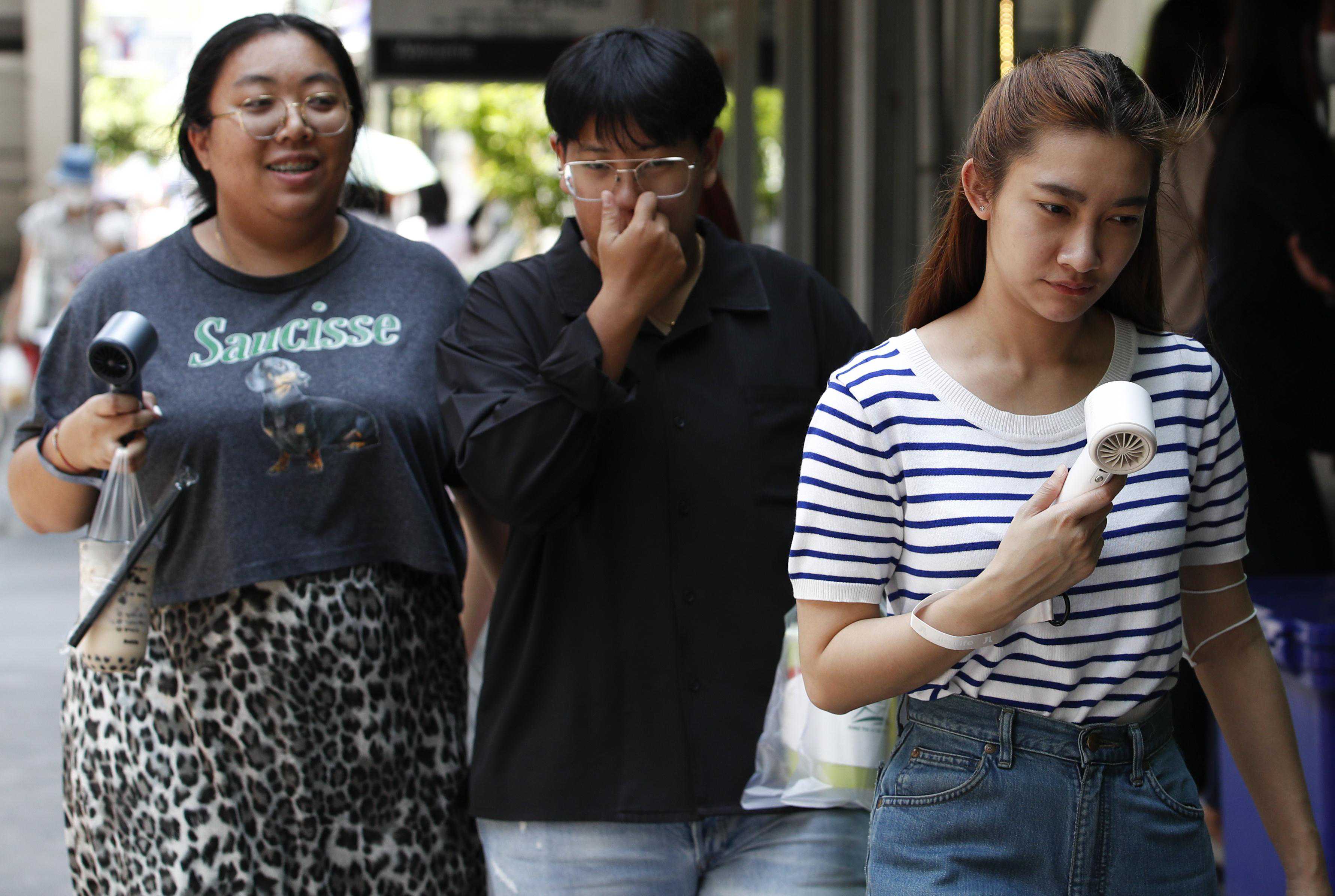 4月2日,在泰国首都曼谷,人们用手持电扇降温。新华社/欧新
