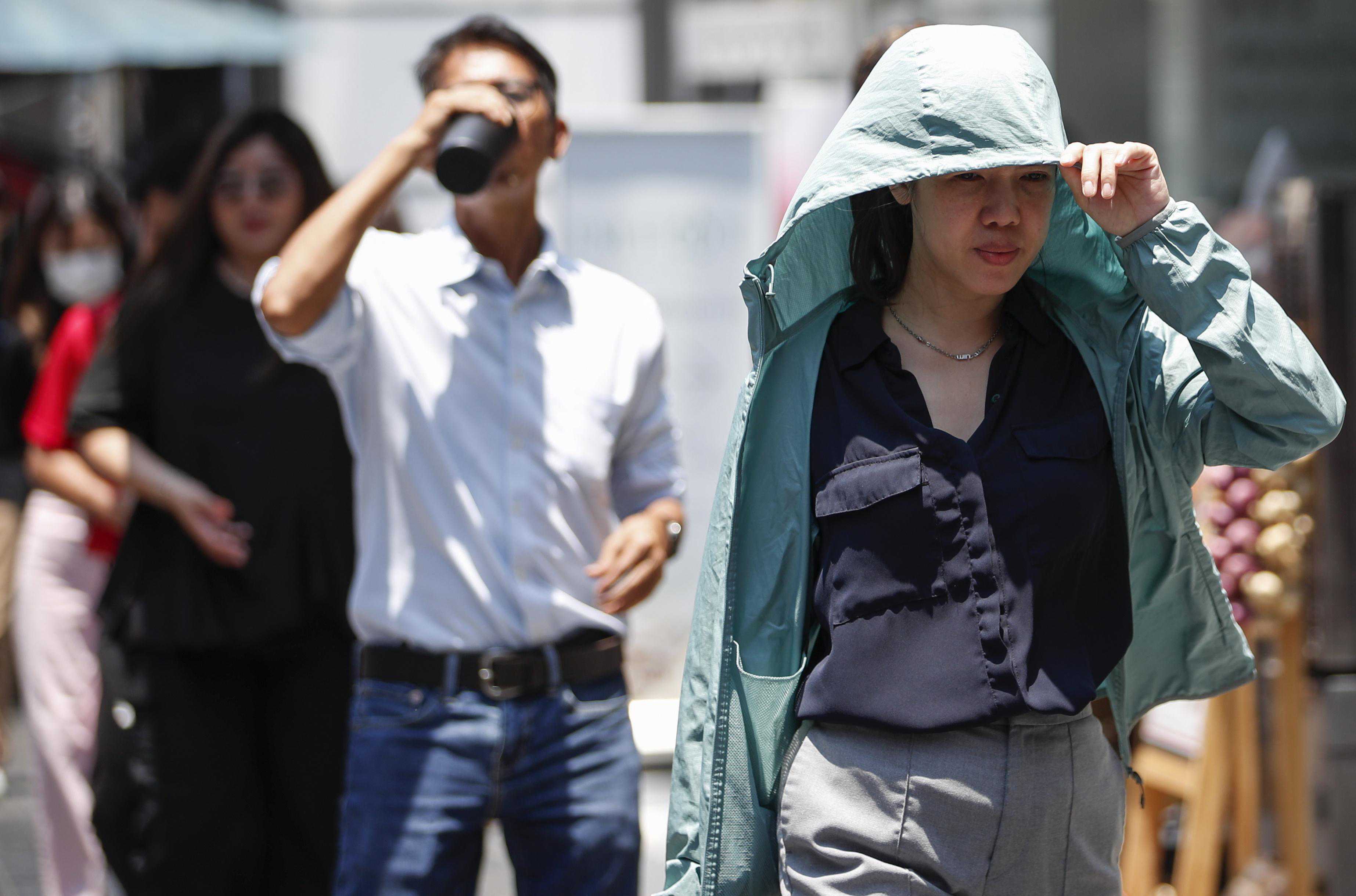 4月2日,在泰国首都曼谷,行人用手持电扇降温。新华社/欧新