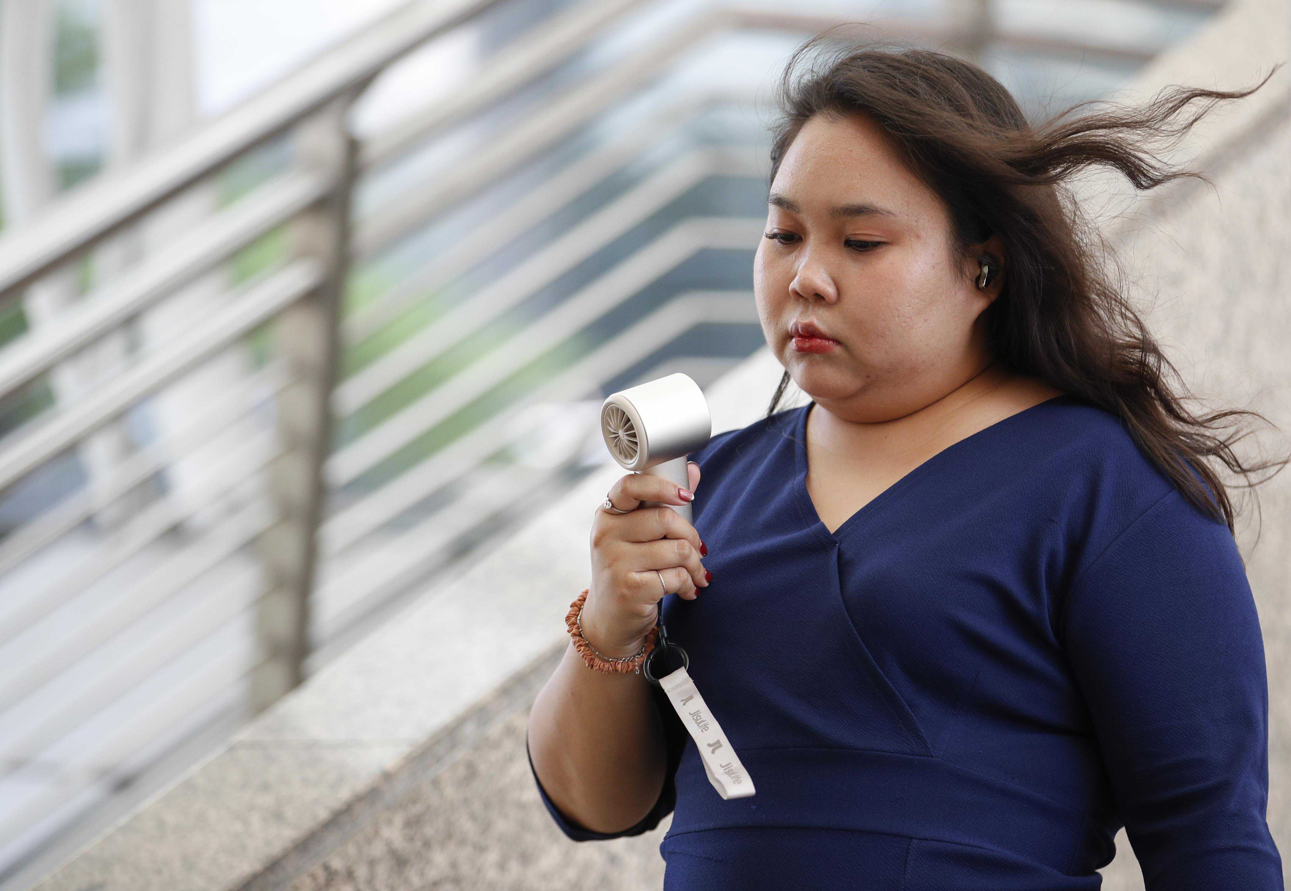 4月2日,在泰国首都曼谷,一名女子用手持电扇降温。新华社/欧新