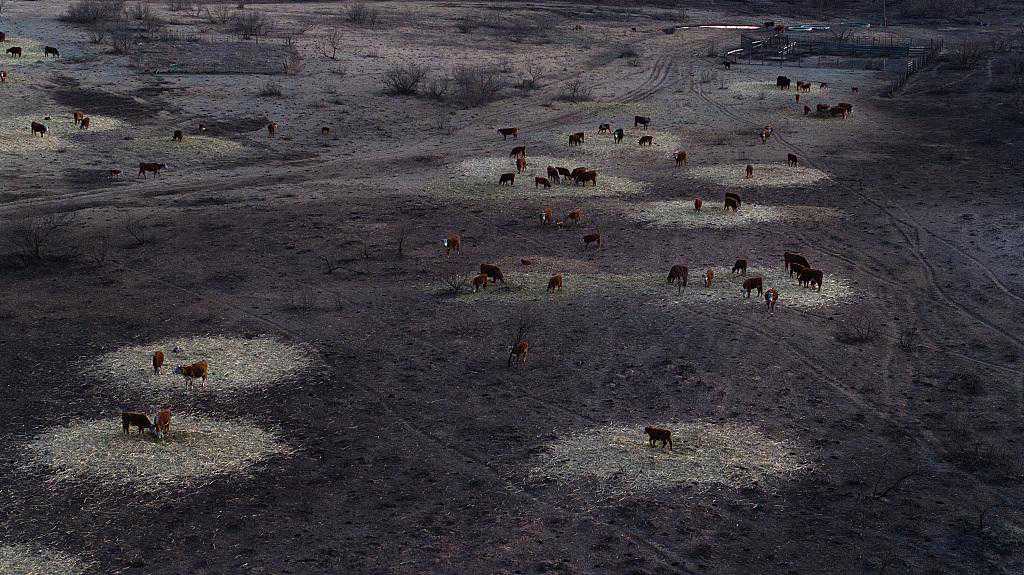 当地时间2024年3月4日,美国得克萨斯州潘汉德尔,野火烧毁该地区后,牛在干草“小岛”中吃草。据报道,美国得州野火延烧逾3000平方公里。