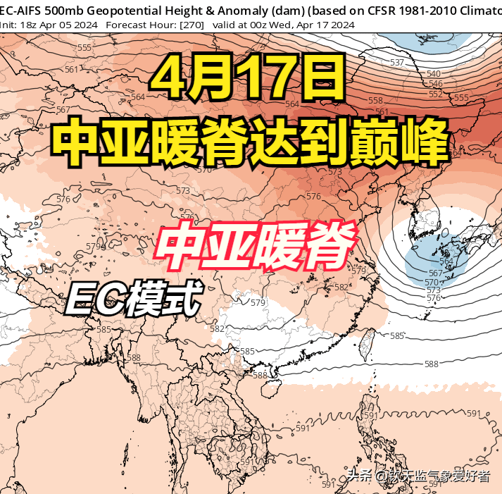这个暖脊是一个暖性反气旋,在它的控制之下,由于盛行下沉气流,冷空气进不来,天气晴朗,太阳光会不被遮挡地直射地面,地面会迅速升温。因此,受它影响,我国西北、华北、东北地区将在4月中旬迎来一波剧烈回暖。目前欧美数值一致预测这个暖脊将在4月10左右自西向东移入我国,并于15日前后达到巅峰状态。