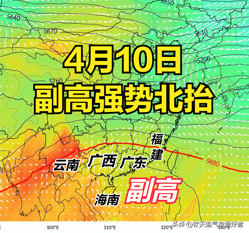 南方地区的升温则更为猛烈,长期处于干热状态的云南依然维持高温少雨的天气格局。值得一提的是,南方的“老朋友”——副热带高压也会在4月10日后重新加强北抬,代表副高的588线将控制云南东南部、广西、广东、海南和福建南部,以上地区将被大量的湿热气流将重新占据,闷热天气将回归。