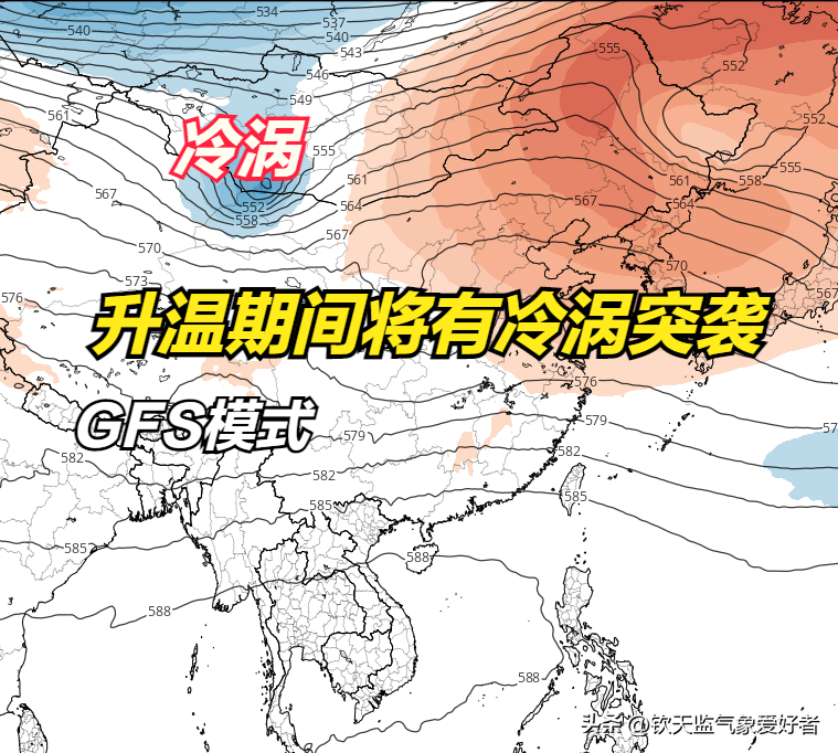 GFS模式的预测意见与EC模式一致:中亚暖脊将使得北方地区迅速升温。不同的是,GFS模式认为,在暖脊控制的间歇会有小冷涡突袭我国北方地区。