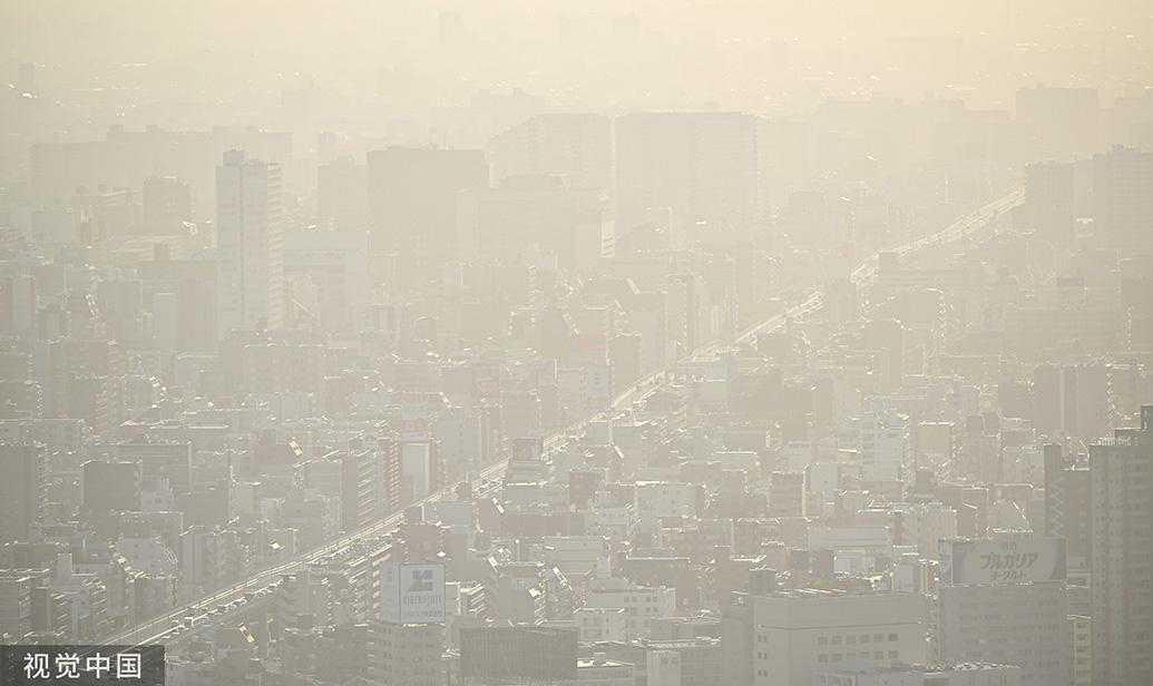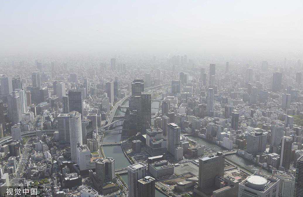 当地时间2023年4月13日,日本大阪,沙尘笼罩着城市。