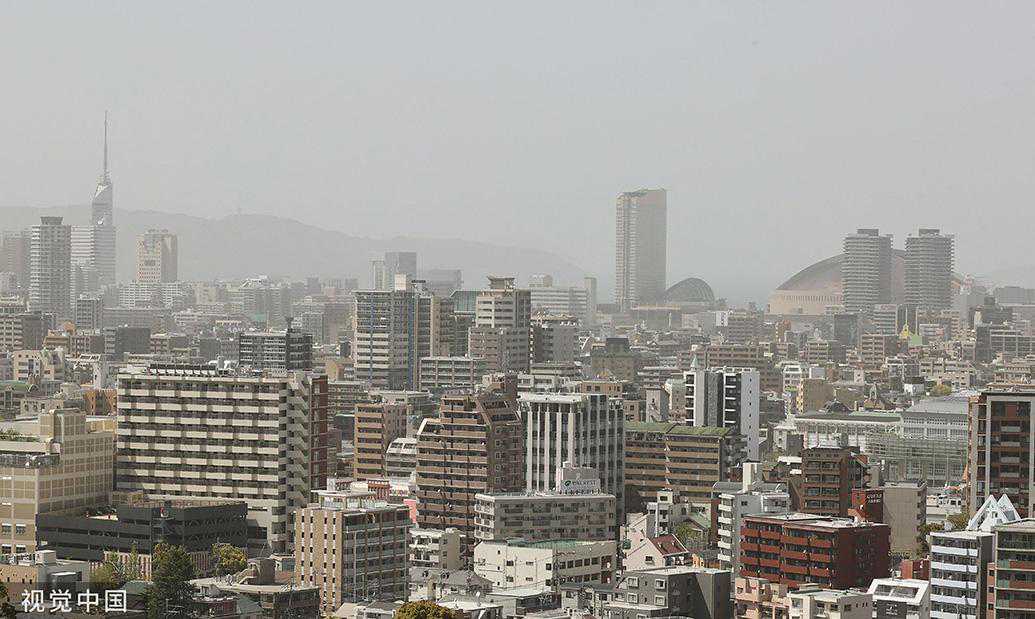 当地时间2023年4月12日,日本福冈市,天空朦胧一片,被沙尘笼罩。
