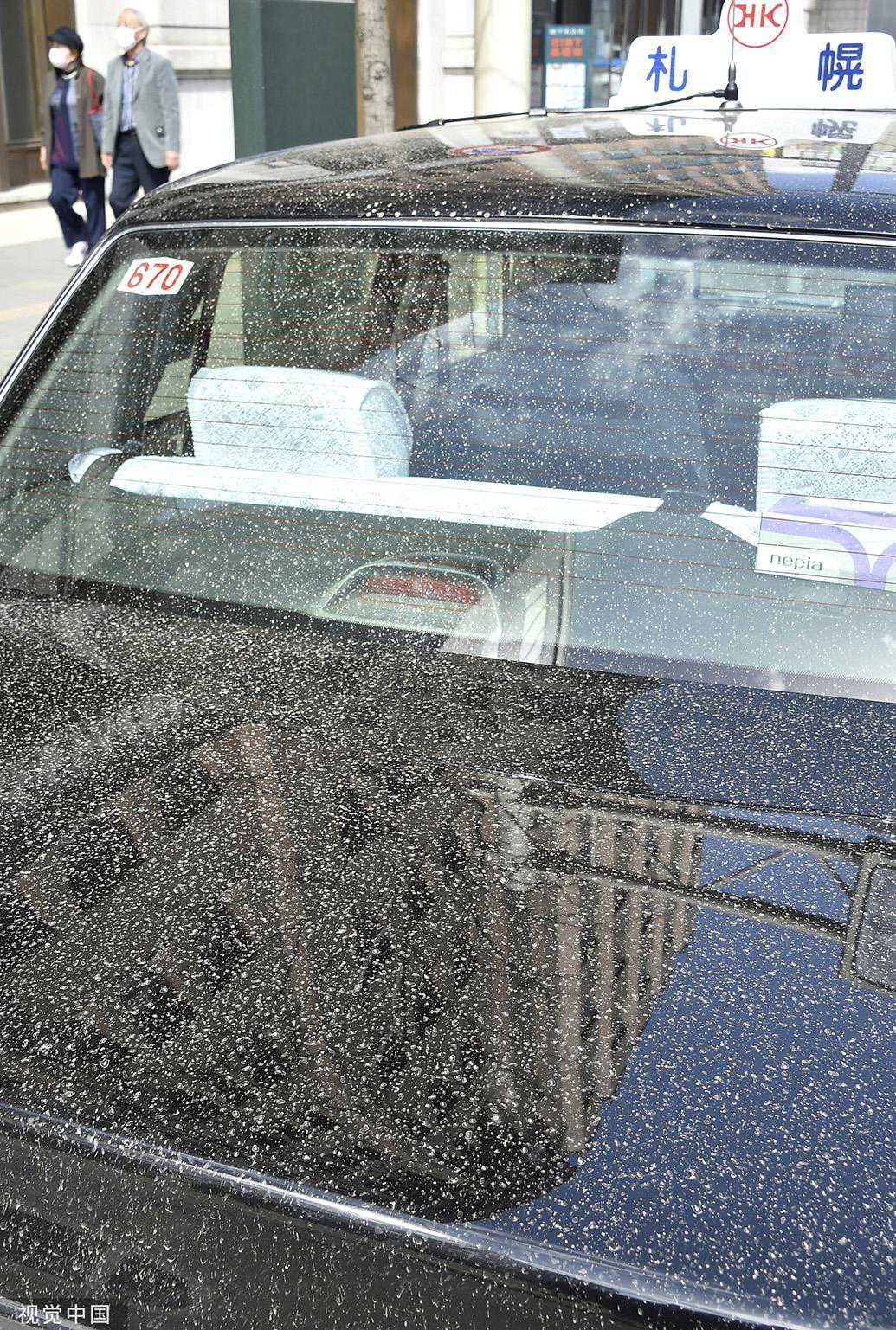 当地时间2023年4月13日,日本北海道札幌,一辆出租车上的沙尘。