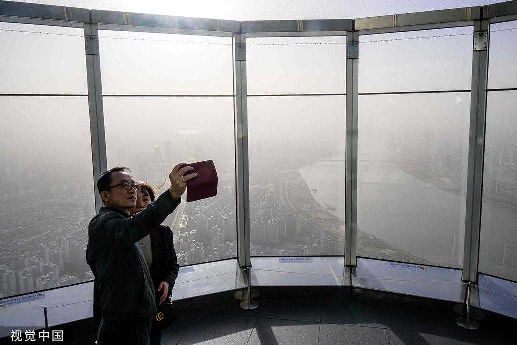 当地时间2023年4月12日,韩国首尔,民众在被沙尘笼罩的建筑物里自拍。